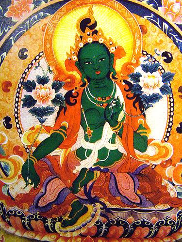 仰仗聖救度母的加持力,一瞬間,原本即將流入村莊的洪水,竟然向右繞轉直接流入大江中,完全沒有對論師的住處和所有的村莊造成傷害。